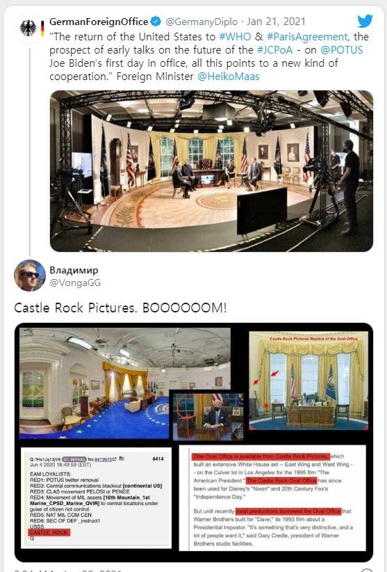 새로운 의문은….이 사진 속의 오벌 오피스는 어디에 있는 것이며 현재 바이든은 어떤 목적을 가지고 있습니까? 우리는 그것이 단지 무대의 일부가 아니라면 그것은 트럭과 창문을 걷는 사람들 때문에 그의 지하실이 아니라는 것을 압니다. 만일 이것이 녹색 화면 백 드롭 green screen back drop, 즉 배경 화면이라면…. 우리가 봐야하는 것, 그들이 이걸 보여주는 의도는 무엇입니까?