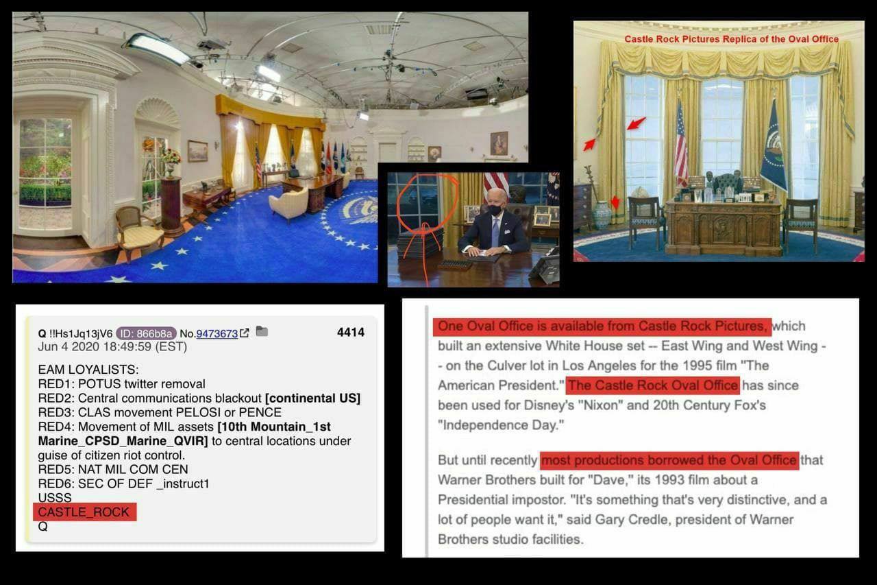 아래 사진은 1995년도 영화 " The American President 대통령의 연인" 의 무대를 만들었던 캐슬록 영화사 Castle Rock Pictures 의 것과 동일하다고 지적합니다. 그 무대는 나중에 디즈니 사의 "Nixon" 에서 썼고 또 20세기 폭스의 "Independence Day" 영화에도 쓰여진 것이라고 합니다. 그러면 왜 바이든은 실제 백악관 오벌 오피스를 쓰지 않고 영화 셋트를 써서 백악관인척 연기를 하는가요?