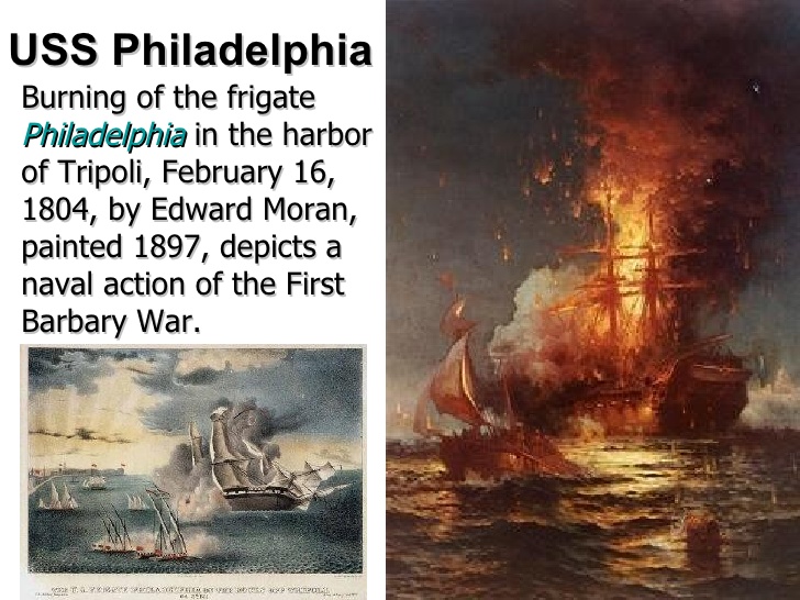 프리기트함 필라델피아호가 1804년 2월 16일 트리폴리 항구에서 불타는 모습, 에드워드 모란이 1897년에 그린 것으로써 첫번 바바리 전쟁의 해군 대결을 표시한다