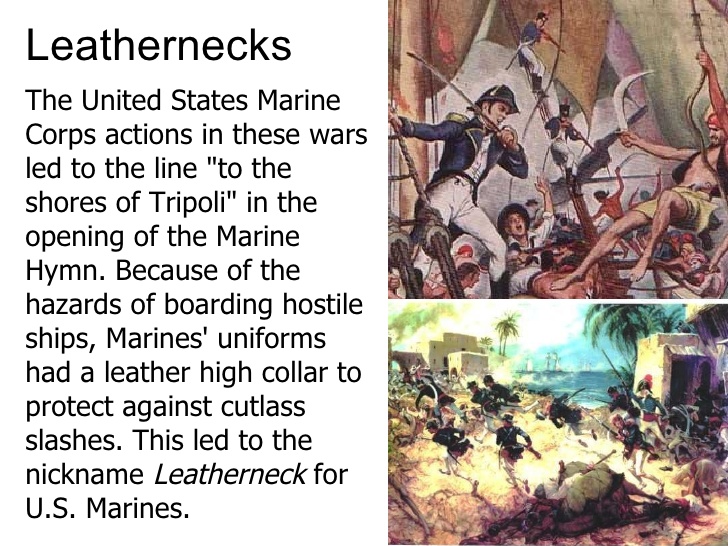 미국 해병대는 이 전쟁에서 "트리폴리 해안까지" 전선을 이어갔다. 이때 해병 전송가를 시작했고 해병은 적군 함정에 뛰어올라 격투를 벌였는데 당시에 입은 전투복은 적군의 칼로부터 목을 보호하기 위하여 가죽으로된 킨 칼라를 착용한 옷을 입었다