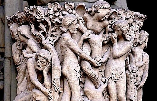 Adam, Eve and the serpent, 13th Century sculpture Notra Dame Cathedral, Paris, France