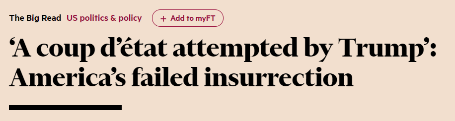 수요일 미 국회 의사당 건물 폭동에 대한 공격적인 대응을 함에 있어서 언론, 민주당, 심지어 공화당원들까지도 이 사건을 "쿠데타 시도"로 규정하면서 징벌적 모략의 의도를 담았는데 이에 한 목소리로 화답했습니다.