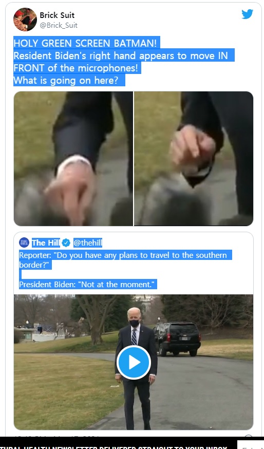 그러나 비디오는 가상의 바이든 Joe Biden의 손이 프레임의 제일 앞에 나타나야 하는 마이크를 가린채 그 앞에 있는 것으로 보여졌는데, 이것은 명백한 비디오 레이어 합성 오류를 보여줍니다. 비디오 편집에서 이것은 비디오 편집 담당자가 전경의 마이크를 가리지 못하여 발생하는 초보자 합성 오류로, 가짜 바이든 Joe Biden (몇 피트 떨어져 있어야 함)이 마술처럼 "실제 "마이크를 가린 채 앞에 서있는 모습을 보여줬습니다.