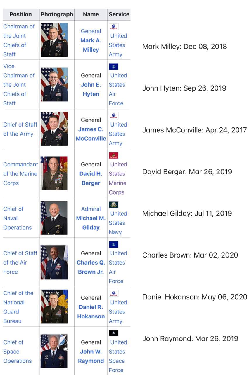 현재 군사 합동참모본부의 모든 구성원은 임기 동안 트럼프에 의해 임명되었습니다. 바이든 행정부가 진정으로 권력을 잡았다면, 이 구성원들은 모두 트럼프 충성주의자이기 때문에 더 이상 자신들의 직위를 유지하지 못하고 제거되었을 것입니다. 그런데 왜, 그들 중 누구도 교체되지 않았는지 궁금합니다.