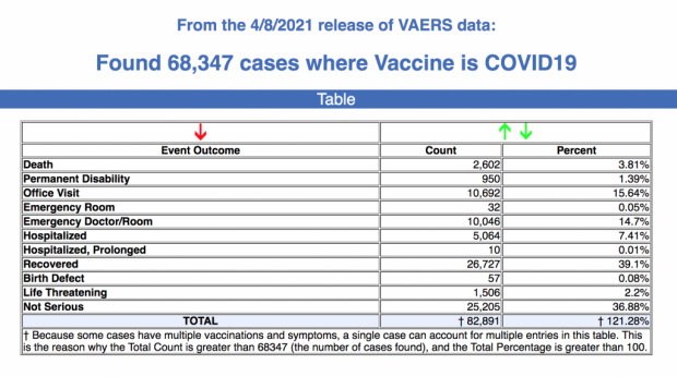 Every Friday, VAERS makes public all vaccine injury reports received through a specified date, usually about a week prior to the release date. Today's data show that between Dec. 14, 2020 and April 8, a total of 68,347 total adverse events were reported to VAERS, including 2,602 deaths - an increase of 260 over the previous week - and 8,285 serious injuries, up 314 since last week.