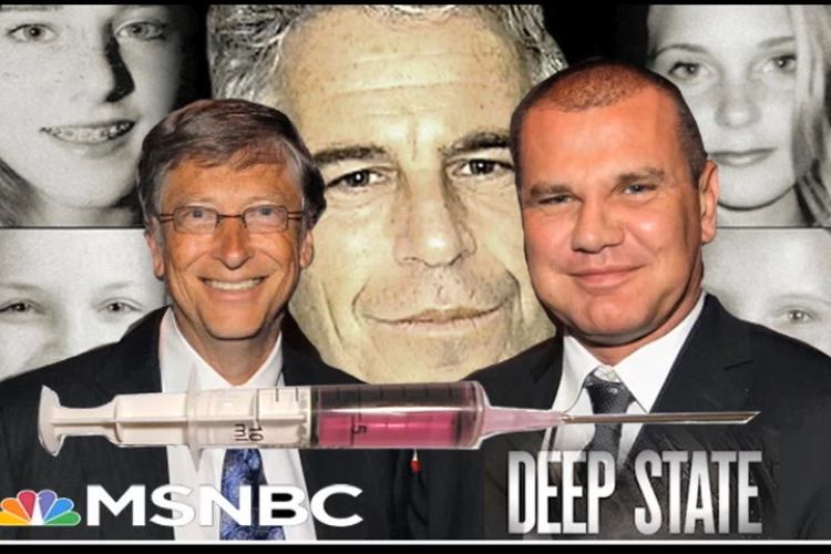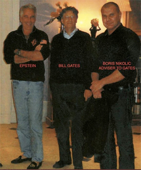 그래픽은 빌게이츠 Bill Gates와 니콜릭 Boris Nicolic과 엡스타인 Epstein i가 그의 성 노예 사진을 배경으로 보여줍니다. Graphic shows Bill Gates and Boris Nicolic with Epstein i the background with photos of his sex slaves.