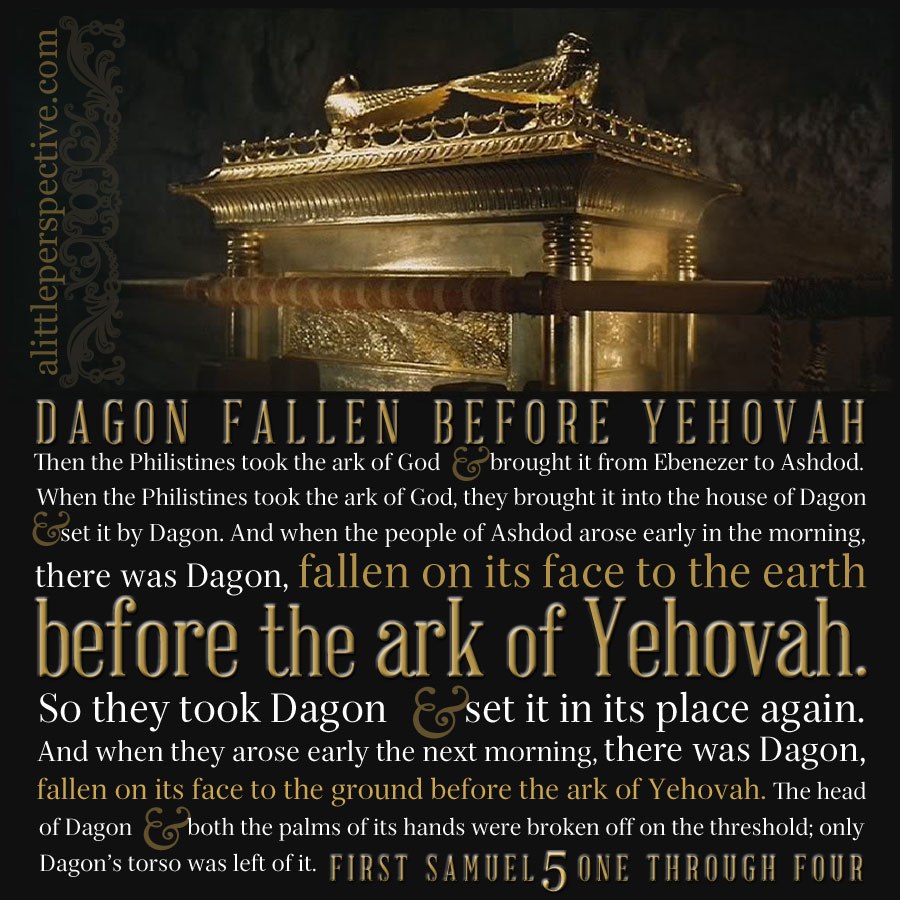 아스돗 사람이 이튿날 일찌기 일어나 본즉 다곤이 여호와의 궤 앞에서 엎드러져 그 얼굴이 땅에 닿았는지라 그들이 다곤을 일으켜 다시 그 자리에 세웠더니