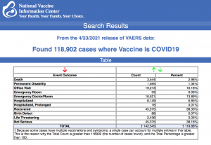 Every Friday, VAERS makes public all vaccine injury reports received as of a specified date, usually about a week prior to the release date. Today's data show that between Dec. 14, 2020 and April 23, a total of 118,902 total adverse events were reported to VAERS, including 3,544 deaths - an increase of 358 over the previous week - and 12,619 serious injuries, up 2,467 since last week.