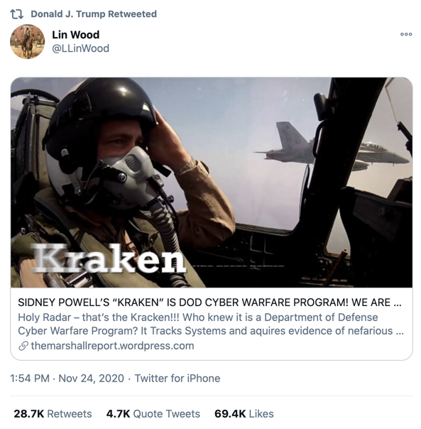 Full article here: How a QAnon conspiracy theory about a "Kraken" government program reached Trump | Media Matters for America