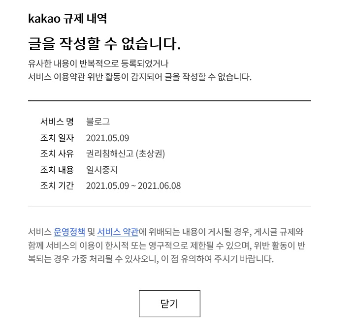 통보 내용은 아래 붙임처럼 유사한 내용이 반복 등록되었거나 권리침해신고(초상권) 사유로 한달간 일시중지 한다는 통보였습니다.